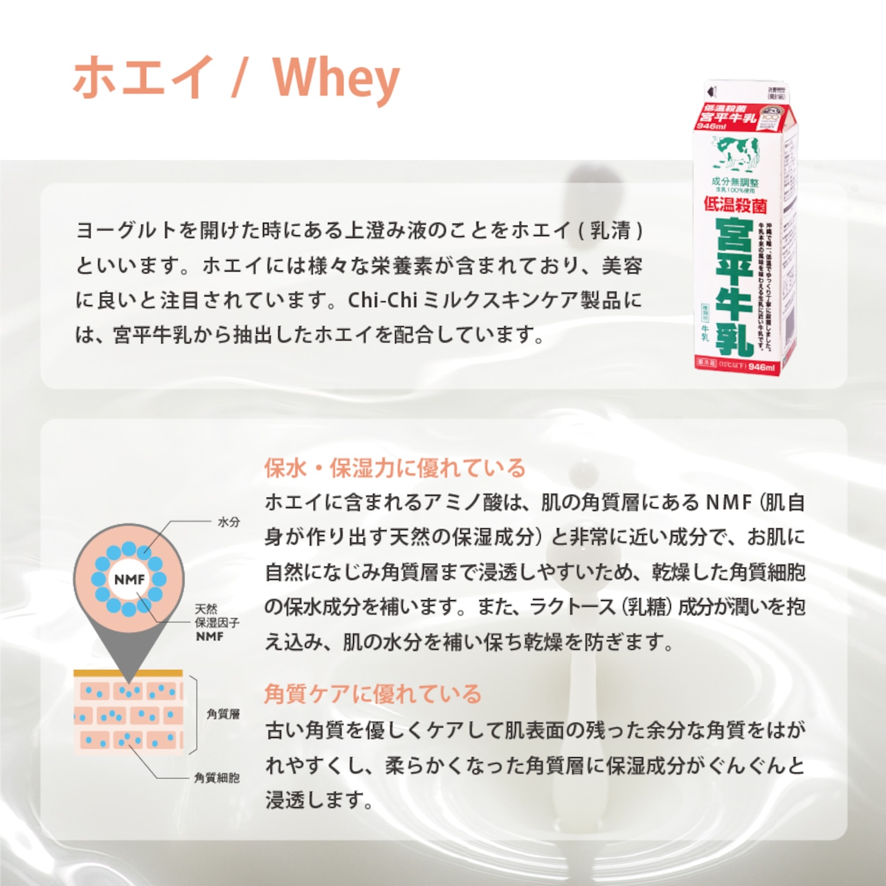 ヨーグルトを開けた時に現れる上澄み液(乳清)は、豊富な栄養素が含まれており、美容に良いとされています。ホエイに含まれるアミノ酸は、お肌の角質層にある自然の保湿因子NMFに近い成分で、お肌になじみやすく、乾燥しがちな角質細胞にうるおいを与えます。